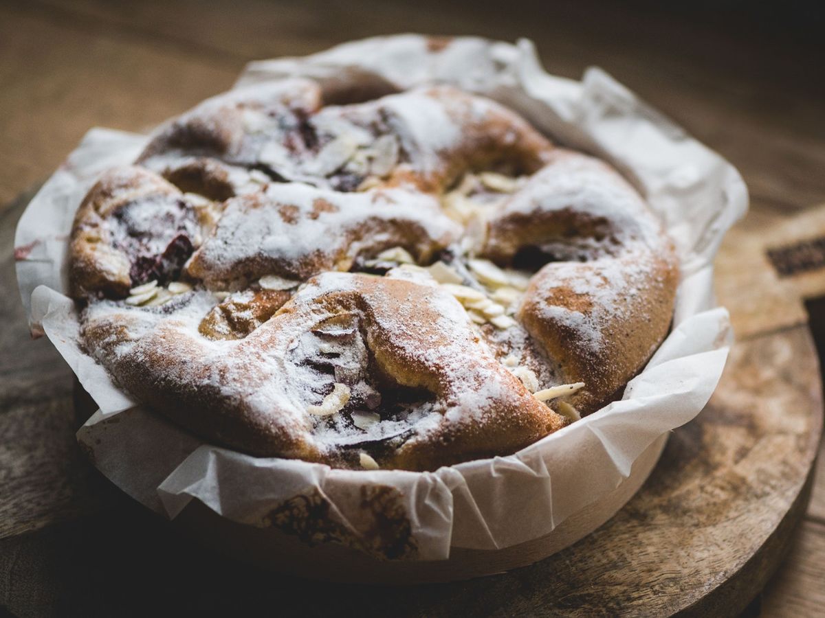 Bazę stanowi wilgotne ciasto biszkoptowo-tłuszczowe, które wypełniamy owocami w rotacji sezonowej – od jabłek i śliwek, przez wiśnie, aż po rabarbar czy porzeczki. Wierzch ciasta zdobią chrupiące płatki migdałów oraz delikatna warstwa cukru pudru, nadająca mu prawdziwie domowego charakteru.